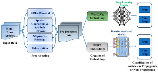 Low-resource text processing is a major hurdle owing to the lack of standard and public datasets. TSHP-17 [] is the earliest dataset seen to address propaganda classification tasks. In [], propaganda was considered a class of fake news analysis. The QProp corpus in [] contains 51,246 articles from news sources labeled using the distant supervision technique. The Proppy dataset [] was collected from 13 propaganda news outlets and 36 non-propaganda news feeds. This dataset was labeled manually to obtain the text fragments from news articles using 18 propagandistic techniques. The dataset was further utilized for the MNLP shared task for fine-grained propaganda classification. In their work, S. Kausar et al. [] created three datasets and a framework called ProSOUL for propaganda detection in Urdu. The first dataset was created by translating the QProp corpus into Urdu, and two other corpuses, Humkinar-Web and Humkinar-News, were obtained from the Urdu webpages and Urdu news articles. The Humkinar-Web and Humkinar-News datasets were labeled using the ProSOUL framework. An Arabic propaganda dataset was developed by [] and released as part of the WANLP shared task for fine-grained propaganda classification in Arabic. This dataset contains 3200 tweets from leading Arabic news sources. Chaudhari et al. [] created H-Prop and H-Prop-News datasets in their work. The H-Prop dataset was created by translating QProp. We can conclude from the previous work discussion that significant work has been carried out on propaganda detection and classification in English news texts and, recently, Arabic texts. However, little work has been conducted on propaganda classification tasks in low-resource languages. The propaganda classification research in Hindi language is limited as compared to English and Arabic. The peculiarities of Hindi and the limited linguistic resources may be the substantial reasons. Notably, no significant results have been reported for propaganda classification in Hindi other than in []. Taking advantage of previous work [], this research proposes classifying propaganda news text in Hindi using deep learning and transformer-based models. In addition, Word2vec embeddings developed using Hindi content were utilized.