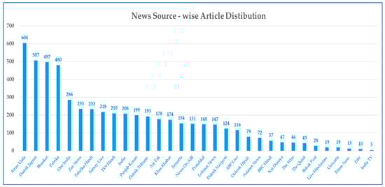 The H-Prop-News dataset was analyzed to understand the distribution of news article sources. Figure 2 shows the news source-wise article distribution in the H-Prop-News dataset. The dataset contained a maximum of 604 articles from Amar Ujala (amarujala.com) and the fewest from India TV. The category-wise article distribution shown in Figure 3 indicates that most propaganda articles were sourced from patrika.com, and most non-propaganda articles come from amarujala.com. A word cloud of the most frequently appearing keywords, as shown in Figure 4, was created to find the top words appearing in the dataset.