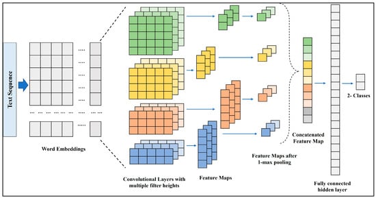 The adopted CNN architecture is shown in Figure 5. This architecture is inspired by the work described in []. In our case, the embedding layer serves as an input to the model. As explained in [], classification quality can be affected by the filter size configuration. Four filter sizes, 2, 3, 4, and 5, were used, which allowed us to focus on smaller and larger sections of the news text. After filtering, a max-pooling layer was applied with a dropout probability of 0.2. The maximum values obtained from each convolutional layer were concatenated to obtain a single vector. This single vector was then processed using a fully connected layer of size 30 and dropout probability of 0.2. The dropout layers help achieve better convergence and avoid overfitting.