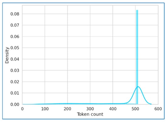 The news article input text was tokenized into a list of tokens using a model-specific tokenizer. For example, the sentence “आप कैसे है” (How are you) will result in six tokens using the mBERT tokenizer as [‘आ’, ‘##प’, ‘क’, ‘##ै’, ‘##से’, ‘है’]. The pre-trained language models use fixed-length inputs. Hence, paddings were added, or extra tokens were removed if required to match the sequence length. Figure 7 shows the distribution of the token counts in the dataset. Padded tokens were not forwarded during the training phase. Hence, the padded tokens were masked. After padding and masking, the generated tokens were inputted into the transformer models and passed through multiple self-attention layers. For each token, a final hidden embedding was generated. The first token related to the beginning of the sequence was considered to generate the probability distribution over the two classes. Our study used four models: multilingual BERT, distill-multi-lingual BERT, Hindi BERT, and Hindi-TPU-Electra.