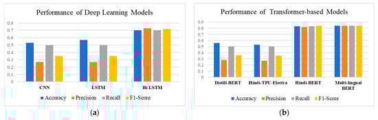 Figure 9 shows the comparative analysis of deep learning and transformer-based models. From the comparative analysis across all evaluation metrics, it is evident that among the deep learning models, the Bi-LSTM model performed the best, and among transformer-based models, the multi-lingual BERT showed the best results. After analyzing the obtained results, it can be concluded that the classification performances of the multi-lingual BERT and Hindi-BERT models were almost on par with each other. Achieving an 84% accuracy, Bi-LSTM models can capture contextual information, thus showing superior results to the CNN. Multi-lingual BERT performed slightly more effectively than mono-lingual Hindi-BERT.