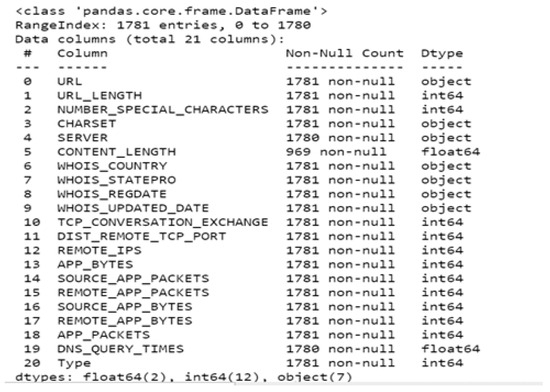 Figure 3 shows a total of 14 numerical data types and 7 object data types. It is evident that the variable ‘CONTENT_LENGTH’ has several null variables that need to be eliminated for analysis. It was also determined that there are no duplicate rows for the data. This data pre-processing leads to a statistical characterization of the data at hand, which is depicted in