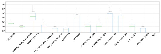 Figure 4. Box plots are a valuable tool for summarizing and visualizing the distribution of numerical data. They provide a clear and concise representation of the data set’s central tendency, variability, and potential outliers. Box plots are particularly useful when comparing multiple data sets or when identifying the overall distribution characteristics of a single data set. It is evident that CONTENT_LENGTH and SOURCE_APP_BYTES have large numbers of outliers, which require treatment. To initiate treatment, the upper quartile, lower quartile, and interquartile ranges were calculated. Obtaining the upper and lower threshold values may give an insight into the outlier ranges.