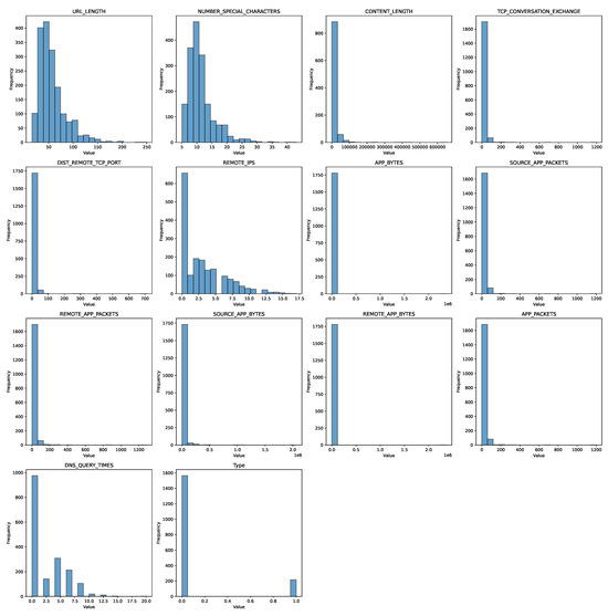 Figure 5. Histograms are valuable graphical representations for understanding the distribution of data sets. They provide a visual summary of the frequency or count of data points falling within specific intervals or bins. Histograms provide a visual and intuitive way to understand the frequency distribution of data sets. By constructing and interpreting histograms for different data sets, researchers and analysts can make informed decisions, identify patterns, and gain valuable insights into the nature of their data. The ability to visualize data in this manner is a crucial skill in data analysis, statistics, and decision-making processes. A correlation matrix shows the correlation coefficients between several variables. Furthermore, it measures the strength and direction of the linear relationship between two variables. Here, the range varies from −1 to 1, where −1 means a perfect negative correlation, 0 means no correlation, and 1 means a perfect positive correlation. The correlation data of the security model are shown in