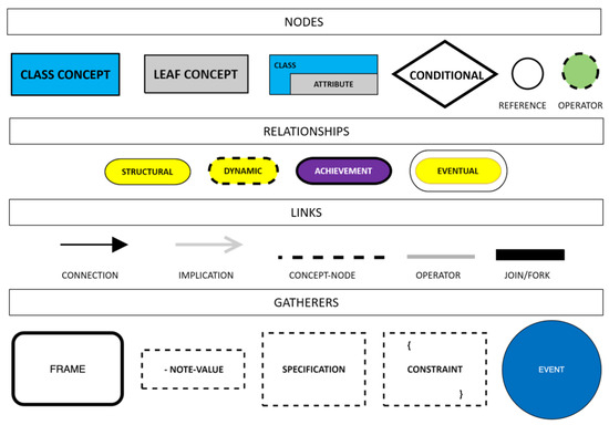 Pre-conceptual schemas serve as visual models that encapsulate and depict knowledge, offering a concise overview of the core attributes of a specific problem domain [1]. They incorporate a domain’s structural and dynamic facets through a controlled natural language, facilitating easier comprehension. Pre-conceptual schemas comprise distinct concepts and static relationships representing their connections as the structure. In contrast, dynamic relationships capture the operations within the representation [2]. The key components of a pre-conceptual schema include concepts, linkages, structural ties and dynamic interactions, which are illustrated in detail in Figure 1.