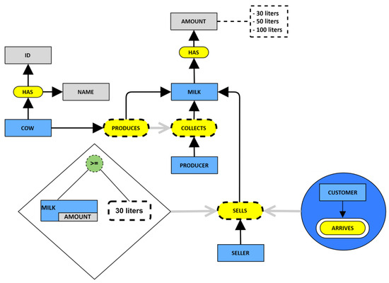 In Figure 2, there are four animated entities—actors—which are: the producer, the seller, the customer, and the cow. It should be considered that milk is expressed in quantities that can range between 30, 50, and 100 L. Following the sequence of the pre-conceptual schema, the cow has an ID and a name. In the same way, the producer collects the milk if the cow has produced it—this is where a relationship of implication stands out. A seller is also involved, who appears just when a customer arrives (an event is triggered in the system), but there is a restriction to make the sale if the amount of milk to be purchased is greater than or equal to 30 L.