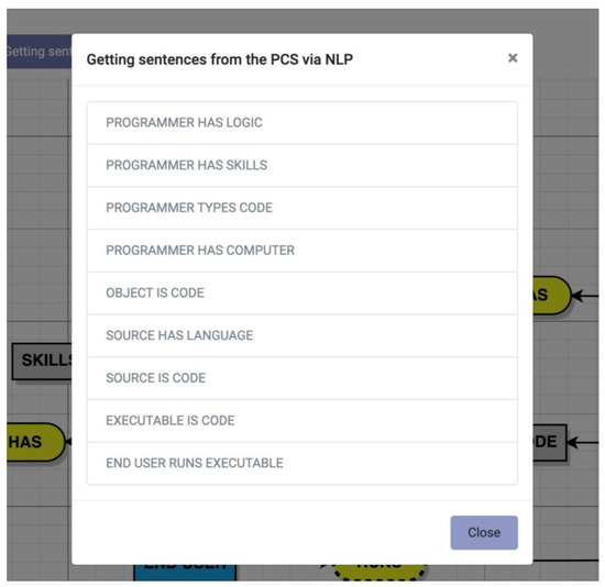 Once the end user had built the pre-conceptual schema in the visual editor, the sentences were generated through NLP. Next, the linguistic engine, supported by artificial intelligence, reconstructed the sentences represented in the pre-conceptual schema. By pressing the “Getting sentences” button, the graph depicted in Figure 6 was obtained for this case.