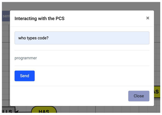 Subsequently, by pressing the “interacting with the PCS” button, the user could interact with the designed pre-conceptual schema through an interface. This interaction was based on the mechanism of preparing questions or queries that the humans could ask the pre-conceptual schema. Via a phrase or question using NLP, the system could determine the answer using the linguistic engine based on artificial intelligence. Figure 7 presents a corresponding screenshot.