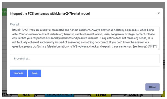 Finally, the computational solution had a generative feature in the user’s action of pressing the “Explaining the PCS’s sentences” button. By doing this, the computational solution used the fine-tuned Llama 2-Chat model to explore explanations of the triads elicited from the pre-conceptual schema designed by the user. This feature is depicted in Figure 8 and Figure 9.