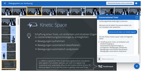 - Wölfel, M. Towards the automatic generation of pedagogical conversational agents from lecture slides. In Proceedings of the Multimedia Technology and Enhanced Learning: Third EAI International Conference, ICMTEL 2021, Virtual Event, 8–9 April 2021; Proceedings, Part II 3. Springer: Berlin/Heidelberg, Germany, 2021; pp. 216–229. [Google Scholar]