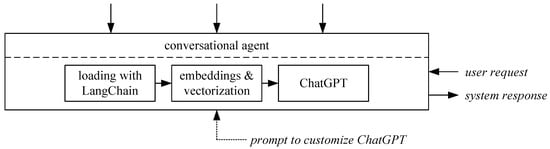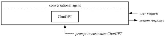 The system was prompted to behave like a teaching assistant while remaining relatively generic and open-ended, as more specific prompts would limit the system’s capabilities too much and the results would lose their generalizability. Our GLM-based system incorporates ChatGPT [] versions 3.5 and 4.0 as the kernel for user conversation and information retrieval from documents. The structure of the generative AI component using ChatGPT without additional data is depicted in Figure 5.