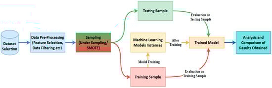 Algorithm 1 presents the algorithm of the proposed model. The algorithm follows a systematic approach, starting with data loading, preprocessing, and sampling. The numbers in Figure 3 explains the sequence of each phase in the whole process. It then iterates over different machine learning model types, trains each model, and evaluates their performance using testing data. Finally, the results, including confusion matrices, are displayed for analysis.