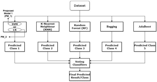 The ensemble machine learning approach used in this paper combines various classifiers, each chosen for its distinct capabilities. SVM excels in determining appropriate hyperplanes for class separation [18], whereas Logistic Regression (LR) models event probability. Random Forest (RF) builds robust decision trees [21], while K-Nearest Neighbors (KNN) performs classification based on the majority class among its nearest neighbours [19]. Bagging uses KNN as its basic classifier to enrich the ensemble further. Boosting uses RF as its base [36]. An important contribution is the Voting Classifier, which combines the various predictions from these classifiers. All of these choices were thoughtfully determined based on their demonstrated performance in earlier research, which was thoroughly detailed in the literature study. This extensive ensemble of classifiers is a deliberate tactic aiming to improve the prediction power of the proposed model.