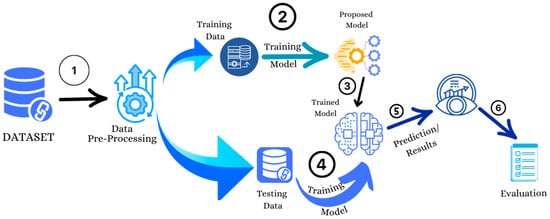 Figure 3 displays the architecture of the implementation process, encompassing dataset pre-processing and the division of the dataset into training and testing data. The training dataset is subsequently input into the chosen models for both the training and testing phases. Following this, the evaluation and results are conducted on the trained model to assess its performance.
