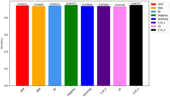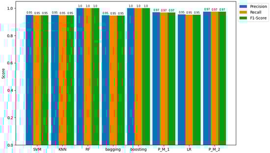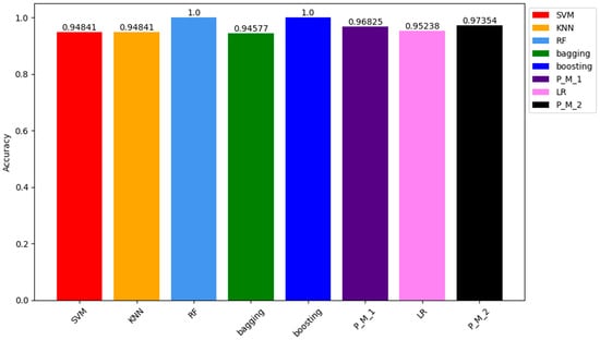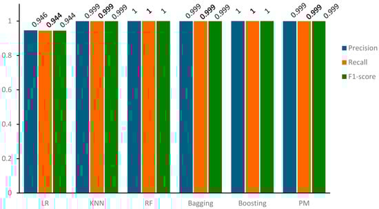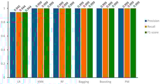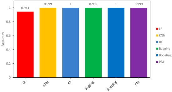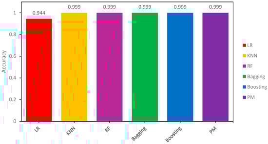 The accuracy results of all models on the testing sample are also shown in Table 9 to demonstrate how the proposed models respond to new data. Results on the unseen data show that the proposed models (PM) alongside Adaboost and Random Forest (RF) classifiers demonstrate significantly high accuracy, with all three converging at roughly 100% on the testing samples. This outcome highlights the effectiveness of these models in comprehending the underlying patterns present in the training data, resulting in predictions that nearly correspond to the accurate labels. Equally noteworthy, the K-Nearest Neighbors (KNN) and Bagging classifiers have a remarkable accuracy rate of 99.93%. These results are also presented visually in Figure 11.