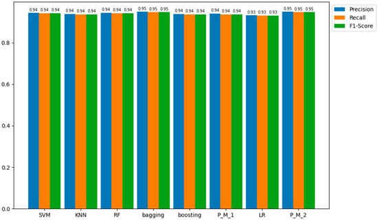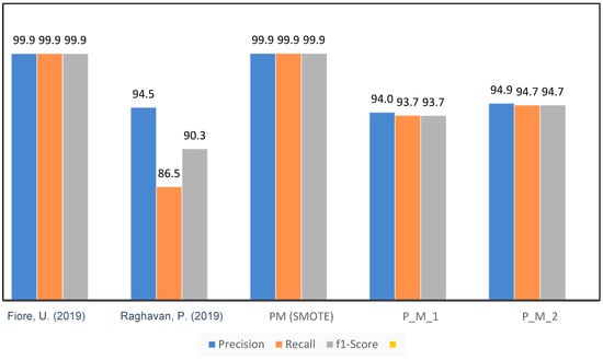 As in the literature review of this paper, different studies have been summarised in Table 1. The models proposed in [1,40] are comparable to the models proposed in this paper. In [40], the proposed model consisted of a K-Nearest Neighbor (K-NN), Extreme Learning Machine (ELM), Random Forest (RF), Multilayer Perceptron (MLP), and Bagging classifier while the dataset used is different than that used in this research. In [1], the proposed model contained Random Forest (RF), K-Nearest Neighbors (KNN), Logistic Regression (LR), Adaboost, and Bagging, similar to P_M_2 in under-sampling and PM in SMOTE. In [1], SMOTE was used for an unbalanced dataset, which was also used for our proposed model. Table 13 and Figure 17 show the evaluation metrics adopted for the benchmarking of the proposed model.