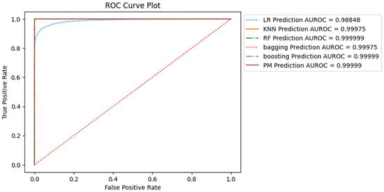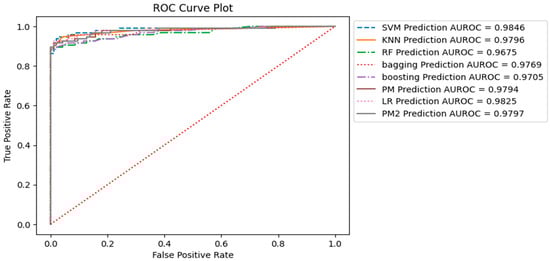 All ROC curves obtained from the SMOTE-sampled dataset, including Support Vector Machine (SVM), K-Nearest Neighbors (KNN), Random Forest (RF), Bagging, AdaBoost, and the proposed model (PM), exhibit exceptional performance, as indicated by the steep ascent towards the upper-left corner of the graph. This demonstrates that these models achieve high sensitivity while maintaining low false positive rates, highlighting their ability to classify positive instances while minimising misclassifications of negative instances accurately. Figure 14 shows the results of the ROC curve of all models, with the AUC-ROC values of all models shown in the bottom right corner.