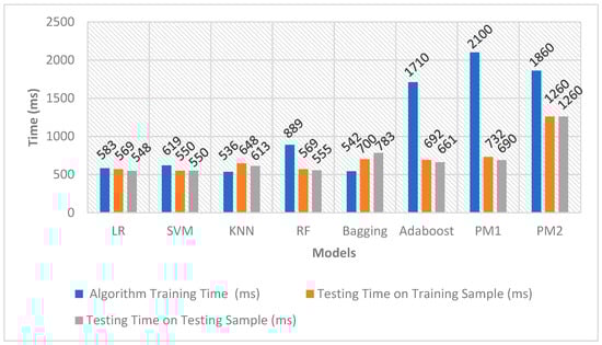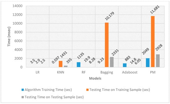 As depicted in Figure 15 and Figure 16, certain algorithms, such as LR, KNN, and Adaboost, exhibited longer training times and shorter testing times. Conversely, other algorithms, including Bagging and PM, needed less training time but had longer testing times. In the case of SMOTE, where the training dataset comprised 440,304 entries, the highest time recorded for evaluating the results on these entries was 11,681 s. Consequently, utilising these computational resources, the system demonstrated the capability to identify approximately 38 entries per second as either legitimate or fraudulent. These observations provide valuable insights into the performance characteristics of each algorithm during both the training and testing phases.