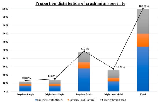 Table 2 and Figure 1 present a detailed proportional distribution of the injury severity levels across the different classification groups. The sample statistics revealed that multivehicle motorcycle crashes during the daytime accounted for the largest proportion of overall crashes (47.34%) within the study period (2021–2024), followed by multivehicle crashes at nighttime (26.27%), and then by single motorcycle crashes at nighttime and daytime. The table highlights the distinct characteristics between single and multivehicle motorcycle crashes. Overall, daytime crashes were more frequent than nighttime crashes, with a 21.05% higher occurrence during the day. However, within single motorcycle crashes, nighttime incidents had a higher proportion compared to those occurring during the day. Furthermore, when separating the data by daytime and nighttime collisions, the statistics indicated that nighttime motorcycle crashes, whether single or multivehicle, tended to result in more severe injuries compared to daytime crashes. Specifically, nighttime single motorcycle crashes showed a fatality rate exceeding 35% (5.03% out of 14.29%), whereas daytime single motorcycle crashes had a lower fatality rate of 23.6% (2.85% out of 12.08%). Similarly, multivehicle crashes at night exhibited the most severe injury outcomes, with a fatality rate of 37.6% (12.17% out of 47.34%) compared to a 25.7% fatality rate for daytime multivehicle crashes.