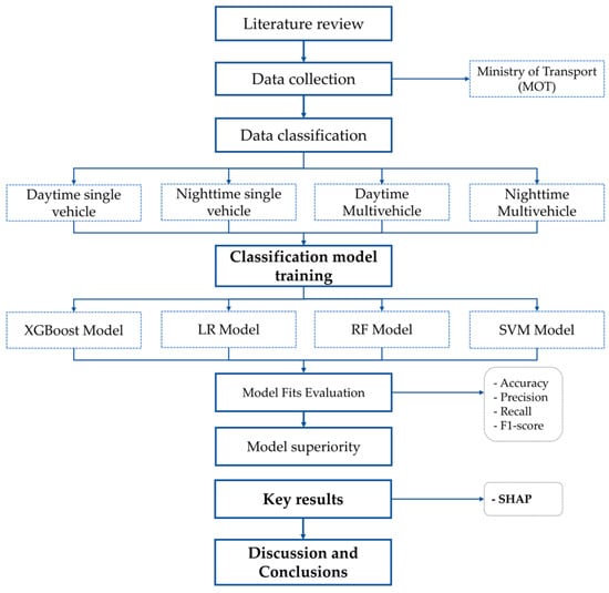 This research commenced with a comprehensive literature review to identify gaps in prior studies and to explore potential methodologies applicable to the current investigation. Following this, motorcycle crash data from 2021 to 2024 were obtained from the Ministry of Transport (MOT). Four statistical models—Logistic Regression (LR), the RF model, the SVM model, and the XGBoost model—were employed to analyze the data, with model fit evaluations conducted to compare their performance. The results from the superior model were then presented, including the SHAP values and corresponding visualizations. Finally, the research discussion and conclusions are provided. The overall framework is illustrated in Figure 2.