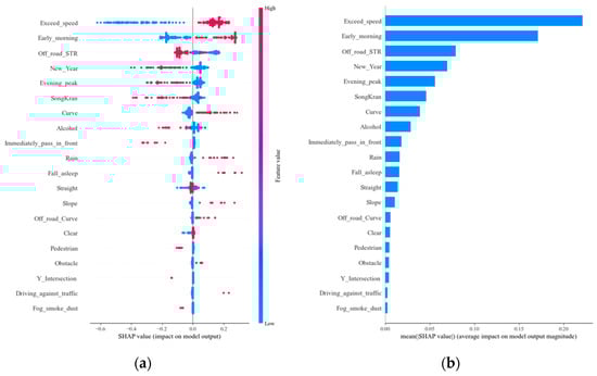 The analysis results presented in Figure 4 reveal that single motorcycle crashes during the daytime shared similarities with those occurring at night, particularly in the significance of certain factors related to the time of day and the causes of the crash. However, the importance of these factors varied between daytime and nighttime crashes. For instance, exceeding the speed limit was identified as the most critical factor influencing injury severity at night. In contrast, the daytime model showed that time-related factors, such as Songkran, New Year, and rush hour (which represent periods of high traffic volume or AADT), had the greatest impact. These factors positively affected the decrease in crash severity compared to other times. This finding aligns with that from the study by Fountas and Anastasopoulos [], which reported that crashes during periods of high AADT are less likely to result in fatalities compared to those during periods of lower traffic volume. Additionally, falling asleep at the wheel emerged as a major cause of single motorcycle crashes during the daytime, significantly influencing injury severity. This situation is particularly dangerous as the driver is unconscious and unable to control the vehicle’s direction or speed []. Conversely, driving under the influence of alcohol has been found to result in less severe injuries during the daytime compared to other causes []. Although drunk driving impairs vehicle control, most intoxicated motorcyclists tend to travel short distances and at lower speeds, leading to crashes that typically involve loss of control but result in fewer injuries. The data revealed that single-vehicle motorcycle crashes due to drunk driving occurred 497 times, with 314 cases (63.18%) resulting in minor injuries and 183 cases leading to serious injuries or fatalities. These findings align with the SHAP value analysis results. In contrast, multi-vehicle crashes involving drunk driving were significantly fewer, with only 184 occurrences. Of these, 73 cases (39.67%) resulted in minor injuries, while 111 cases (60.33%) led to serious injuries or fatalities. Similar to the nighttime model, sharp curves and road curvature were also identified as significant factors that increased injury severity in single motorcycle crashes during the daytime []. Given this evidence, enhancing curve protection features and equipment is critically important to prevent single motorcycle crashes.