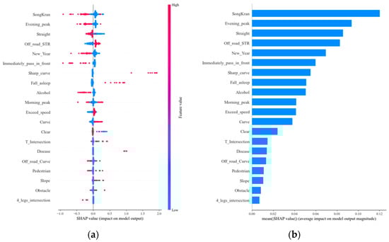 Daytime single motorcycle crash results: (a) SHAP summary plot and (b) importance ranking of variables based on mean absolute SHAP value.