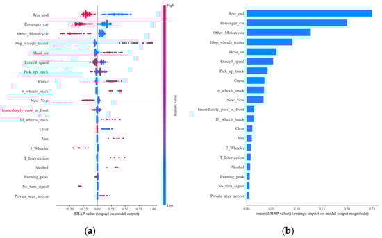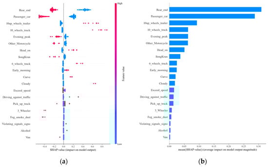 Daytime multivehicle motorcycle crash results: (a) SHAP summary plot and (b) importance ranking of variables based on mean absolute SHAP value.