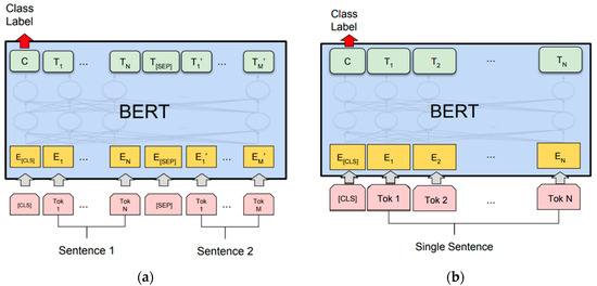 Fine-tuning BERT model in two different downstream tasks: (a) next-sentence prediction task; (b) single-sentence classification task [2].