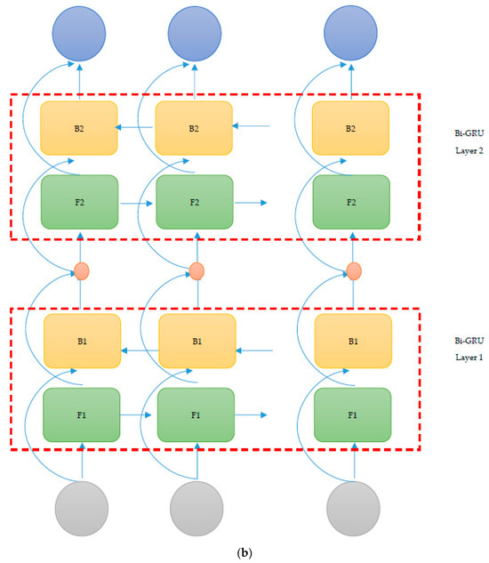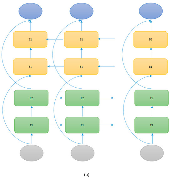 Two different ways of stacking multiple layers of RNN cells: (a) Multi-Cell BiRNN; (b) Multi-Layer Bi-RNN [25].