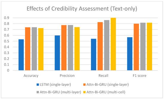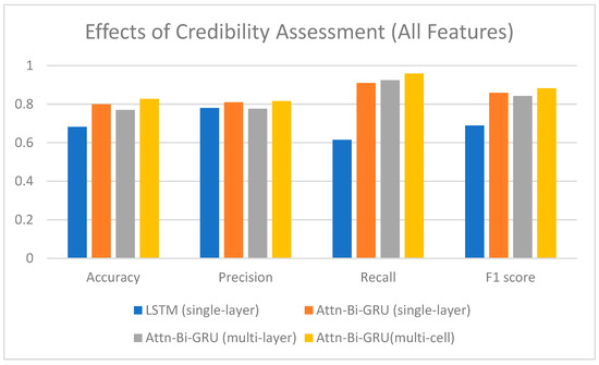 To evaluate the effects of credibility assessment on the performance of misinformation detection, we adopted different types of RNNs using only text features as our baseline models: single-layer RNN [14], single-layer Attn-BiRNN, multi-layer Attn-BiRNN, and multi-cell Attn-BiRNN [25]. According to our previous research [25], a better performance of rumor detection can be obtained when using GRU instead of LSTM in different RNN structures. In our experiments, we only compared the performance of different variations of RNN structures using GRU with the baseline models on Twitter rumor detection datasets, as shown in Figure 5.