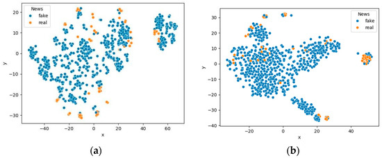 Figure 7. The visual representation of the fake and real posts (a) without fine-tuning transformers and (b) with fine-tuning transformers.