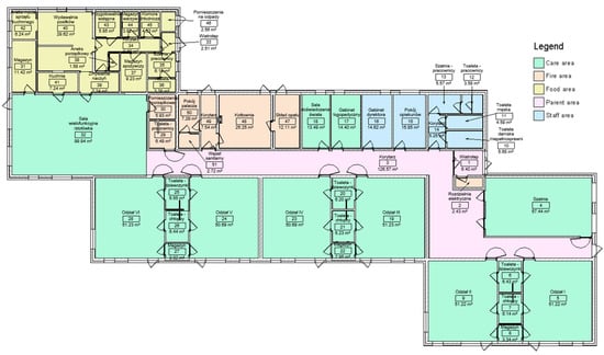 In this work, it was decided to produce a summary of zones. But before doing so, a division of the facility into spaces was generated, which in the future can be supplemented with information on energy analysis, e.g., heating load, cooling load, air flow, and lighting. Then, naming each space and assigning it a number, they proceeded to combine them into individual zones. Five of them were specified in the facility: the care zone; the staff zone; the parent zone; the food zone; and the PM zone, or fire zone, and each zone was given an individual color (Figure 3).