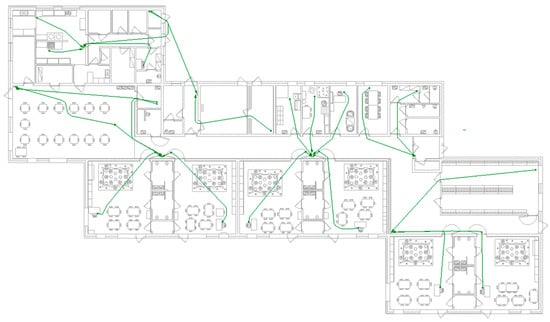 The next step was to run a simulation to analyze the distance between the two locations (Figure 4). The path generated, for the units located in the nursery, had the route start next to the caregiver’s desk. On the other hand, in the other rooms, the longest possible distance to the fire extinguisher was selected. The result that was obtained was paths to the fire extinguishers. It should be added that the paths themselves were based on elements present in the model, i.e., components that were treated as obstacles (such as benches). Revit, when determining the paths, bypasses them by 0.3 m, considering the value of 0.25 m for the radius of the body and 0.05 m for ensuring free movement. The speed of the access path is calculated based on the walking speed, which is about 4.828 km/h. All routes have been marked in green, indicating that the managers follow the rules and take care of the safety of the wards.