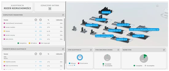 The level of saturation of non-graphical data can refer to the quantity as well as the quality of data. This is all the information that is used to comprehensively manage a building facility. Throughout the life cycle of a building, data are collected, the volume of which should increase after each stage of work. At the very beginning, the data that pertain to the building/building/infrastructure facility itself should be identified. The identified data are intended to show, for example, what function the facility has; what area it is located in; and the characteristics of the building, floors, rooms, and zones. Nomenclature and numbering usually follow standard naming conventions given by manufacturers and organizations. Identified data that pertain to component group and type should also be classified based on industry standards [28]. The three most widely used systems for classification, costing, etc., are Uniformat, OmniClass, and MasterFormat. The first refers to building components related to materials and where they were built. The second system is useful for creating material libraries and organizing product literature and project information. It contains a combination of the other two systems and is used as a basis for MasterFormat or Uniformat, for example. Omniclass is considerably expanded and consists of construction information on objects, separated spaces, products, work results, and materials. MasterFormat, on the other hand, is used for institutional and commercial projects in Canada and the United States. The system primarily presents cost data and related information contained in the design, estimates, and specifications [29]. Next in importance is the classification of data on equipment, materials, and finishes. These data provide knowledge of any parameters that relate to product manufacturers, models, serial numbers, acquisition dates, dealer leads, and any warranties and information on their use or expiration dates. Subsequently, specifications and attributes can be linked to any data on types and other values, as well as detailed data on weight, power, energy consumption, or spare parts. The last non-graphical data should relate to the operation and maintenance of the facility itself. The model should be supplemented with data on maintenance statuses and their history, as well as data on space occupancy [30].
