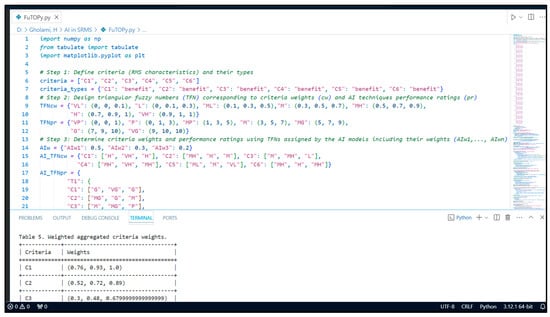 To this end, the proposed method (FuTOPy) is applied to solve such decision-making problems following the steps defined in Section 3. This approach is particularly well suited for situations in which decisions are complex and involve uncertainty or vagueness, allowing for a more intelligent analysis compared to traditional crisp decision-making models. As shown in Figure 1, the script was executed in a Python 3.12.1 environment using Visual Studio Code (VS Code). This version of Python provides advanced features and improved performance, ensuring efficient handling of complex calculations involved in fuzzy logic processing. vs. Code is a highly popular, free, open-source integrated development environment (IDE) developed by Microsoft. It is widely recognized for its versatility, user-friendly interface, and robust support for a wide range of programming languages, including Python [98]. It effortlessly integrates with Python 3.12.1, allowing us to write, execute, and debug the script to solve multicriteria decision-making problems in fuzzy environments.