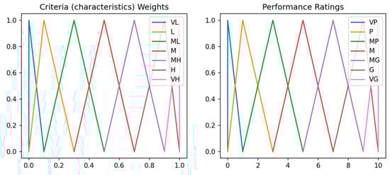 Reviewing the inputs (Figure 1) reveals that six criteria (C1–C6) were defined for evaluation, with each criterion categorized as either a “cost” or a “benefit” in # Step 1. This classification is crucial, as it impacts how the criteria are normalized and weighted during the analytical process. Figure 2 illustrates TFNs designed in # Step 2. The linguistic terms (ranging from “Very Low (VL)” to “Very High (VH)”) are translated into TFNs. This mapping allows LLMs to express their feedback in an effective manner, acknowledging the inherent uncertainty and subjectivity in assessing the importance of criteria. Similarly to weights, the performance ratings are expressed in linguistic terms (ranging from “Very Poor (VP)” to “Very Good (VG)”) and converted into TFNs. In # Step 3 (Figure 1), the AI_TFNcw represents the aggregated feedback of three LLMs (ChatGPT-4, ChatGPT-40, and ChatGPT-40mini) on the importance of each criterion. Each criterion’s weight (cw) is expressed in linguistic terms, later to be converted into TFNs using the TFNcw. Next, these TFNs are aggregated to form a consensus or average representation of each model’s feedback based on the weights given to the LLMs (AIw1, AIw2, AIw3) by using Equation (8). A similar process is conducted for the AI techniques ratings across all criteria. Table 3 and Table 4 show the criteria weights and the performance ratings of the 17 AI techniques given by the LLMs, respectively.
