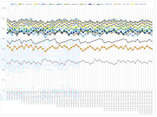 # Step 9: This study conducted a sensitivity analysis (SA) by varying major criteria weights to evaluate the performance of AI techniques for SRMSs. In this regard, 62 experiments were conducted, each representing a different condition, to evaluate the various combinations of the six criteria/characteristics. For each experiment, a new set of CC values for all AI techniques using Equation (18) through the AI-enabled methodology was programmatically calculated. Figure 3 shows the SA of the current study, revealing the performance of AI techniques across 62 experiments. Consequently, AI techniques “T5” and “T10” consistently exhibit higher closeness coefficients across most experiments, indicating their robust applicability and effectiveness in enhancing multiple core characteristics of SRMSs.