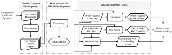 In this paper, the authors seek to bridge the research gap on the absence of PTLMs built for solving Indonesian government domain-specific tasks. Since Bidirectional Encoder Representations from Transformers (BERT) models have proven to be highly effective in addressing various NLP challenges [28] and are known to be superior to other machine learning approaches (e.g., see [29,30,31,32]), a BERT-based architecture was chosen to develop the PTLMs in the presented research. This research, therefore, puts forward a BERT-based domain-specific language model pre-trained with governmental texts to effectively process SDG-related documents in the course of Indonesian government decision-making. An effective methodology for the development of high-performance PTLMs for solving downstream NLP tasks is also proposed. All resources necessary to implement the methodology (source code, text corpora, etc.) have been made publicly available at https://github.com/Just108/IndoGovBERT (accessed on 30 September 2024).