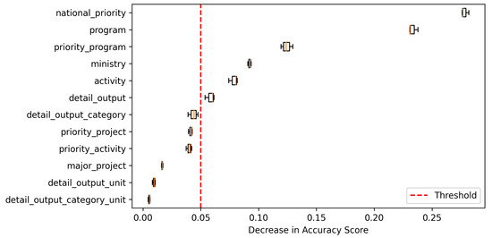 The budget data collected were subjected to preprocessing, as suggested by Riyadi et al. [52]. To reduce irrelevant and noisy information, the data were also manually cleaned by BAPPENAS specialists. Missing values and formatting inconsistencies were handled to standardize the dataset. Feature selection was conducted to retain significant attributes by assessing variable permutation importance of a Random Forest classifier [53]. For the dataset, features with an importance score exceeding 0.05 were considered important, reducing the number of input features from 12 to 6 for further analysis (see Figure 3). The importance score threshold was set based on human judgment. Table 3 exemplifies the six remaining features. Since all these features assume a textual format, the corresponding texts were concatenated to form a single string input for the classifiers.