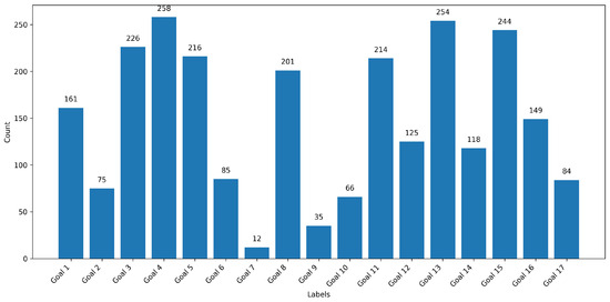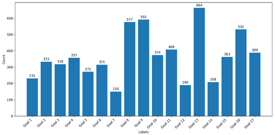 The preprocessing steps yielded 4875 unique data entries with a label distribution, depicted in Figure 4 (the total sum over all goals is different due to the presence of multi-label assignments). The average document length is 34.5 words, and the maximum length is 64 words.