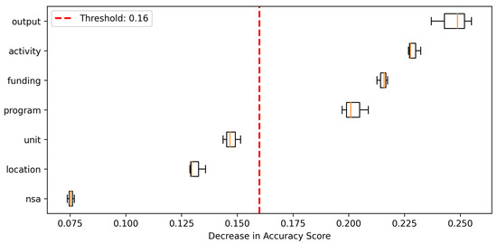 The NSA data comprise documents describing non-government programs and activities that involve civil society and philanthropic organizations, academic institutions, and other entities of the RAN collection. These data were subjected to preprocessing in the same way as the budget data. Results of the feature selection, based on permutation importance, are shown in Figure 5. The selection threshold was set at 0.16, thus reducing the number of features from seven to four. The remaining features are listed in Table 4, together with specific examples. The same text-concatenation approach as in the case of budget data was applied to form the classifier input.