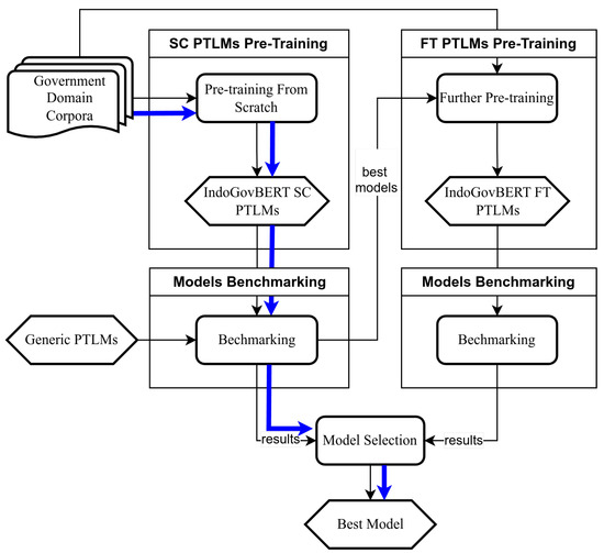 An overview of the specialized PTLM development methodology. Model development phases of the best-performing version of IndoGovBERT PTLM are shown with the thick blue arrows.