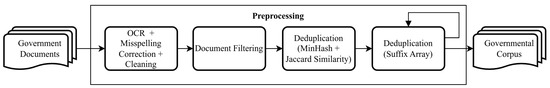 As indicated in Table 5, a majority of the collected documents are in PDF, a popular format for document storage in various organizations worldwide, including the Indonesian Government. While PDF provides for a consistent visual appearance across different applications and platforms both on screen and in print, extracting text from the files can be challenging, especially when dealing with historical documents [54]. Details of the preprocessing procedures of text extraction, filtration, and deduplication of the PDF files are explained in the next subsection.