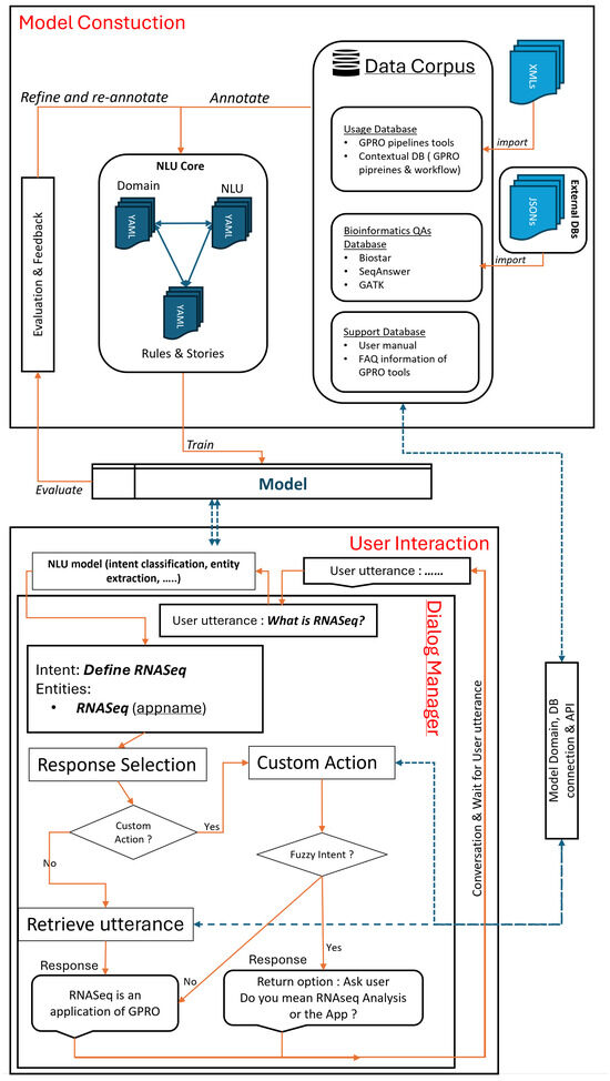 Figure 2. Example of user interaction flows with the pipeline of one of the GPRO tools. More interactive diagram are available at https://gpro.biotechvana.com/genie (accessed on 17 November 2024). - Support database: This database was created by extracting information on questions and answers from the user manuals and FAQ information from the websites of every tool in GPRO. This database was manually curated and classified into different intents based on user expectation. The database contains about 8097 questions/statements classified into 338 intents, divided into 2920 questions classified into 120 intents for Genie and 5177 questions classified into 218 intents for Abu.
