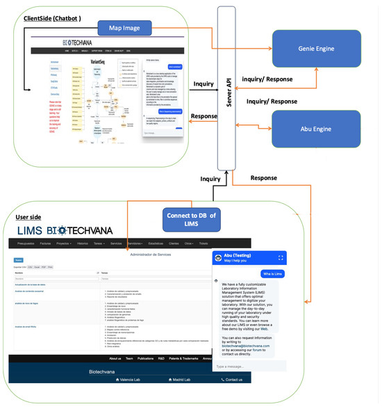 In this work, we have introduced and described a Rasa-powered chatbot infrastructure specifically designed for the complex landscape of bioinformatics in both management and analytical tasks. The chatbot infrastructure offers a bilingual interface to seamlessly transition between English and Spanish. The architecture of the chatbots allows users to explore the complexities of the applications of the GPRO platform and LIMS, as well as to ask questions and receive insightful answers regarding the most common pipelines and workflows. Users can collect relevant information in real-time, enriching their bioinformatics endeavors. A notable step up in the chatbots capabilities include its interaction with map images. Users can effortlessly click on regions of interest within an image, prompting the GPRO chatbot to intuitively respond to questions regarding the specific interface of GPRO applications described. This feature not only enhances user engagement but also simplifies the exploration of complex bioinformatics tools. Bilingual proficiency, database connectivity, and image interaction capabilities lay the foundation for a more comprehensive, user-centered bioinformatics experience. The integration of the chatbot with Laboratory Information Management Systems (LIMS) represents a significant leap forward in streamlining laboratory operations and enhancing user engagement. In Figure 4, we show the integration of the chatbots within the bioinformatics suites.