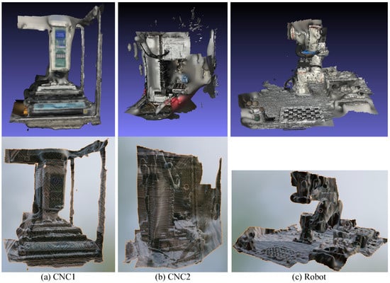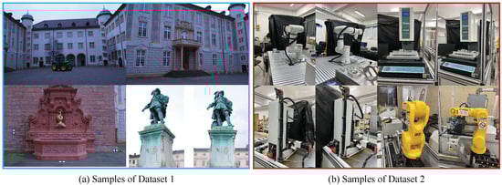 A public dataset (hereinafter referred to as Dataset 1) was used to evaluate the application of the reconstruction algorithm in large-scale scenes, such as the external environment of factories, and contains 200 images of building structures in eight categories, with corresponding internal camera parameter files. In addition, a private dataset (hereinafter referred to as Dataset 2) was established, which contains 48 high-definition images of two kinds of robotic arms and two types of CNC machining centers, as representatives of common factory equipment. Examples of the two kinds of datasets are shown in Figure 1.
