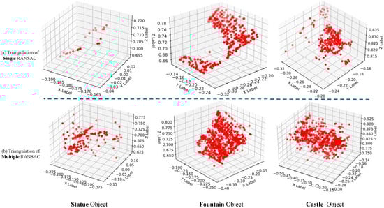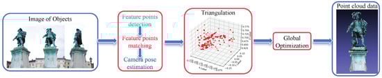Representative algorithms for photogrammetry methods include structure-from-motion (SfM) and multi-view stereo (MVS) []. Current SfM algorithms can be categorized into incremental SfM, global SfM, SfM integrated with deep learning, and combined SfM with MVS reconstruction methods. Gao et al. [] developed a multi-view 3D reconstruction system fusing SIFT and SURF features for enhanced point detection, applying scale constraints for robust matching and using RANSAC for error removal. These enhancements significantly outperformed bundle adjustment [] in robustness and completeness. With continuous algorithmic advancements, global SFM offers enhanced reconstruction accuracy and efficiency compared to incremental SFM, due to the simultaneous consideration of all image factors []. The main framework of global SFM includes global similarity estimation, feature extraction and matching, and camera pose estimation []. To enhance algorithm efficiency, the visual bag-of-words model is used in global similarity estimation []. Recent algorithms such as NAPSAC, PROSAC, and P-NAPSAC have been developed to expedite robust feature point estimation. PROSAC starts by sampling from points with the highest probability based on global prior ranking [], NAPSAC utilizes spatial coherence by sampling from points with high inner line ratios [], and P-NAPSAC combines local and global sampling methods for improved accuracy [].