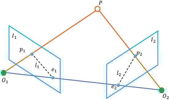 where and are pixel locations of point P in the pixel planes of two cameras. Given the intrinsic parameters of the camera, the concept of an essential matrix is introduced here [], simplifying the equation as