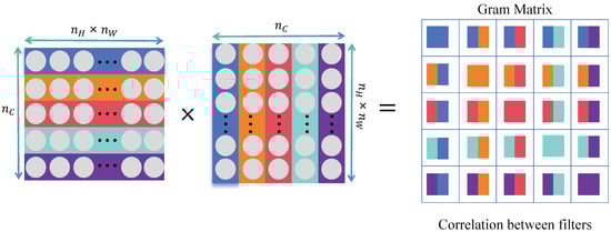 The style of an image is represented by a style matrix. To capture the texture representation of the input image, a Gram matrix [], as shown in Figure 9, uses a symmetric matrix formed by the pairwise inner products of k vectors in an n-dimensional Euclidean space, representing these vectors’ texture features.