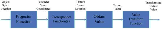 Mathematically, a projector function is applied to spatial points to obtain parameter space values, which are then converted to texture space using corresponding functions. The algorithm’s flow is illustrated in Figure 11.